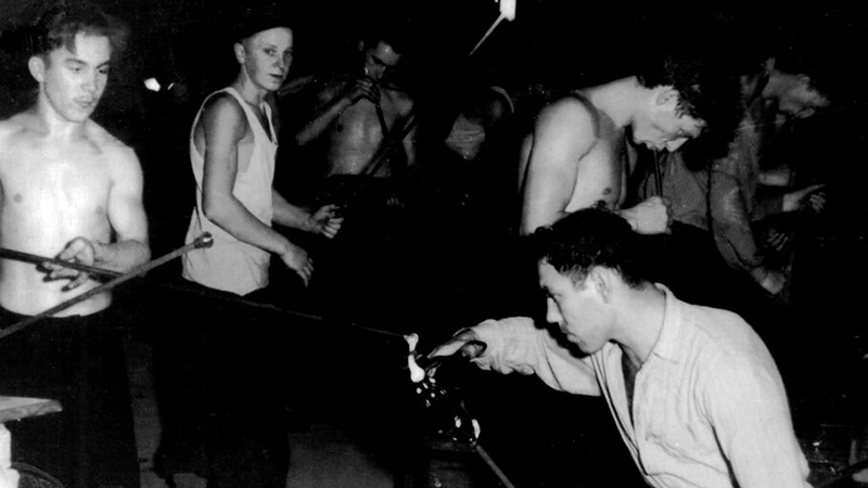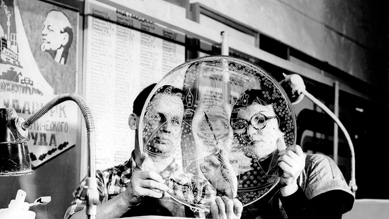 «Мастера художественного оформления В отделочный цех стаканы поступают с острыми краями. Пить из такого стакана нельзя,— можно порезать губы. Поэтому как говорят на заводе «Укрепление коммунизма», — стакану надо заправить края. Заправщица Маруся Федулова сидит у наждачного круга. В руках у нее стакан. Рядом сложенные пирамидой заправленные и не заправленные стаканы. Наждачный круг вертится, «съедая» острые углы стакана. Внимательно смотрит за работой наждака Маруся. Платок на ее голове сбился назад. Вот он упал на пол. Но Маруся не замечает. Она увлеклась работой. — Сколько эта девушка заправит краев у стаканов? — спрашиваем начальника цеха. Начальник цеха — Егор Герасимович Луцкий сам лично работал на всех видах обработки стекла. О лучших своих ударниках он рассказывает с радостной, теплой улыбкой. — Маруся Федулова за смену заправляет 860 стаканов,— говорит Луцкий. — А норма? — Норма 775 стаканов. Да, но так работает не одна только она. Михайлова Наталия, Федулова Наталия, да и другие подруги Марии не уступают ей в работе. Все они соревнуются на лучшую заправку, на высокую производительность. Отопочные машины. Здесь проходит окончательная обработка края стакана. Большой круг медленно вращается, увлекая с собой стаканы в жаркое полымя форсунки. Вращаются и сами стаканы. После такой обработки края стаканов становятся овальными и гладкими. Шлифовальщики. Это мастера — художники своего дела. Под действием вращающегося наждачного круга в их умелых руках на стеклянной посуде появляются разнообразные красивые рисунки. Вот бригадир и мастер Тябин. Он берет чистый стакан и через полторы-две минуты на стакане выточена кисть винограда, ветка с лепестками или другой более сложный рисунок. Разные рисунки делаются на стаканах и разная норма выработки. Сейчас Тябин по норме должен выточить в смену рисунки на 250 стаканах. Но он делает 280. С меньшим количеством он мириться не хочет, да и не может, потому что мастер Вахромкин, с которым он соревнуется, выполняет план на 112 %. Прежде чем упаковать посуду и отправить потребителю, она должна пройти еще одну стадию обработки — полировку. Здесь тоже идет соревнование на лучшее качество продукции и высокую производительность. Мастер полировщик Толстов 4 октября побил все рекорды полировки. Он отполировал 882 стакана вместо 444. Так развертывается соревнование в отделочном цехе. В этом соревновании растут люди, герои труда, растут мастера своего дела. Выработанная ими продукция своим качеством может поспорить с продукцией заграничных заводов. А. Дементьев» («Призыв», 12 октября 1935). «СОРЕВНОВАНИЕ В ГУТЕ Петр Яковлевич Михайлов все время в движении. То он идет распорядиться прибавить газа — «повернуть винтиль на четверть оборота» — чтобы погорячей было. То баночнику дает указания, пониже наклоняться к ящику, когда освобождает трубку от стекла. То идет в отрезной цех рассказать работнице, что сделать, чтобы не было «стрижки» и чтобы стаканы обрезались ровно-ровно. Неугомонный человек Петр Яковлевич Михайлов,— начальник гутенского цеха! Петр Яковлевич знает всех в цехе, от мастера выдувальщика до относчика. Знает, кто как работает и почему так работает. — Лучшие мастера? — Есть лучшие мастера,— говорит Михайлов.— Вот Василий Александрович Никифоров. Он бригадир. С ним работает мастером Коробов и бан