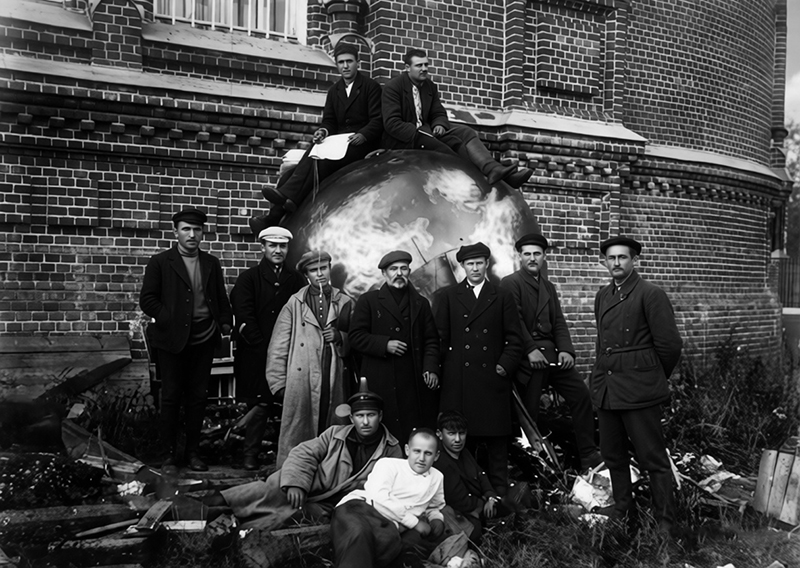 В 1923 г. церковь Вознесения Господня была закрыта … На одной из фотографий, хранящихся в фондах Камешковского музея, запечатлены инициаторы закрытия и разрушения церкви у поверженного купола. В центре (стоит) Долбилкин Петр Осипович, слева – секретарь партячейки Тимофей Иванович Борисов, крайний справа – директор фабрики Василий Федорович Цыганов.