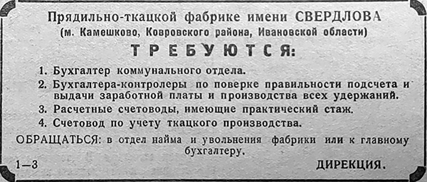 «На фабрике имени «Свердлова» работает много временных рабочих. Нужда во временных квалифицированных рабочих у фабрики большая и ощущается все время. Недавно потребовалось сразу около 40 ватерщиков и банкаброшниц. На учете биржи труда их не было. Фабрике пришлось набирать неумелых рабочих, в число которых попали имеющие связь с деревней, многие — из зажиточных крестьян. Безработные же дети рабочих и переростки остались опять за бортом производства. Фабричному управлению необходимо организовать подготовку на квалифицированные должности детей рабочих и переростков» («Призыв», 6 сентября 1928).