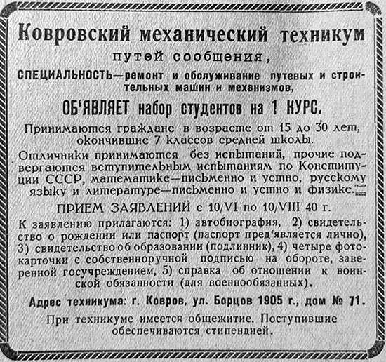 Рыбенков А.Д., работавший в 70-е годы заместителем начальника отдела учебных заведений Горьковской железной дороги, вспоминал: «Я поступил в техникум в 1924 году. Тогда здание техникума было небольшим. Училось всего 120-130 человек. У нас было 4 аудитории, актовый зал лаборатории и очень скромные учебные мастерские. Были большие трудности с учебниками и учебными пособиями. Но мы старались хорошо учиться, активно участвовали во всех делах и мероприятиях, проводимых в техникуме. Регулярно выходила стенгазета «Сигнал», была неплохая художественная самодеятельность, футбольная команда. Мы гордились своим техникумом и старались быть достойными его учениками. Сам я проработал в области подготовки технических кадров на Горьковской железной дороге 31 год. Ковровский техникум до перехода его в ведение Министерства транспортного строительства находился в ведении Горьковской железной дороги и являлся основным поставщиком специалистов для нашей дороги. Ранее он давал кадры для Московско-Курской, Нижегородской и Муромской железных дорог». «При ковровском техникуме путей сообщения обучается 155 человек, из них 58 человек, более нуждающихся, пользуются бесплатный столом и общежитием. Занятия техников заключаются в 7 теоретических и 2 практических уроках в день. В силу этого при техникуме есть несколько мастерских: столярно-модельная, слесарная, кузнечная, токарная и стеклография. Техникум имеет 4 класса. Кончающий их получает звание техника 1 разряда. Имеется 5 кружков. Профсекция с 143 членами, политкружок с 109 членами и т. д. Занятия кружков идут регулярно. За правильностью постановки работа смотрит местная фракция РЛКСМ. При техникуме есть библиотека с 2000 томами книг и читальня. В читальне устроен уголок Ленина. По вечерам в ней бывает громкая читка газет и журналов. Читальня тесна, и работу шире развить не представляется возможным. Гордостью всех техников является стенная газета «Сигнал». В ней 70 добровольных корреспондентов освещают жизнь техникума, его недостатки и хорошие явления. Около половины ребят участвуют в работе местного рабочего клуба т. Ленина, состоят в различных кружках и т. п.» («Призыв», 26 февраля 1925). В 1926 г. имел 120 учащихся и 20 учителей. «В ковровском техникуме НКПС имени тов. Рудзутака сейчас обучается 2 девушки — дочери рабочих. Девушки заняты столярным делом и ничуть не уступают в работе ребятам. Эти две девушки — первые в нашем техникуме, в котором до 1926 г. обучались исключительно только мужчины» («Призыв», 2 марта 1926).