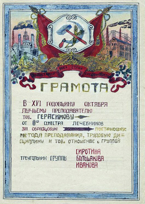 Грамота лучшему преподавателю Герасимову Михаилу Георгиевичу от 3-го семестра лечебников владимирской фельдшерско-акушерской школы за образцовую постановку метода преподавания, трудовую дисциплину и товарищеское отношение с группой. 1933 г.