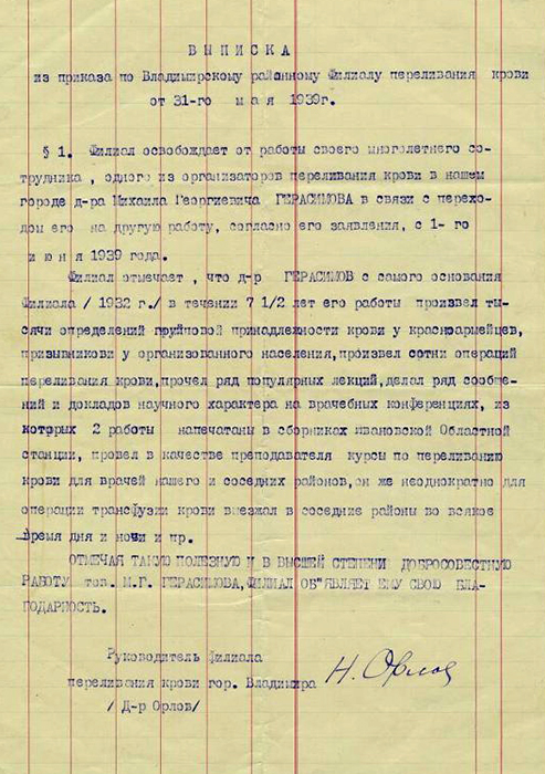 Выписка из приказа по Владимирскому районному филиалу переливания крови с благодарностью за хорошую работу врачу Герасимову Михаилу Георгиевичу. 31 мая 1939 г.