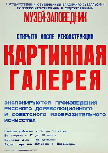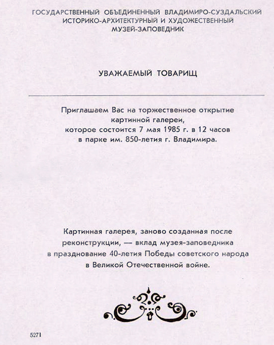 Приглашение Государственного объединенного Владимиро-Суздальского историко-архитектурного и художественного музея-заповедника на торжественное открытие картинной галереи, 7 мая 1985 г. в парке им. 850-летия г. Владимира. Бланк. Афиша Государственного Владимиро-Суздальского музея-заповедника «Открыта после реконструкции Картинная галерея». 1985 г.