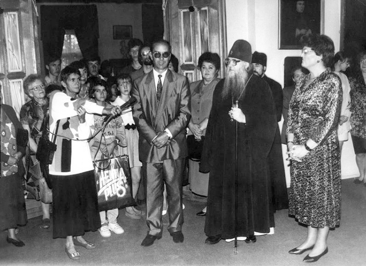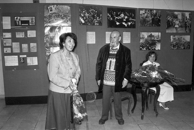 Заместитель директора по научной работе Владимиро-Суздальского музея-заповедника Тенеткина Алмасарида Алимовна поздравляет художника Юкина Владимира Яковлевича с открытием персональной выставки в Картинной галерее. Сентябрь 1995 г.