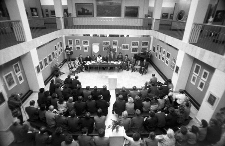 Встреча журналистов газеты «Советская Россия» с творческой интеллигенцией г. Владимира в Картинной галерее Владимиро-Суздальского музея-заповедника. Выступление главного редактора газеты «Советская Россия» Чикина Валентина Васильевича. 5 сентября 1989 г.