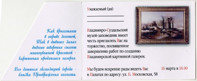 Приглашение Владимиро-Суздальского музея-заповедника на торжество, посвященное завершению работ по созданию Владимирской картинной галереи 16 марта 1999 г. в Палатах. Бланк.