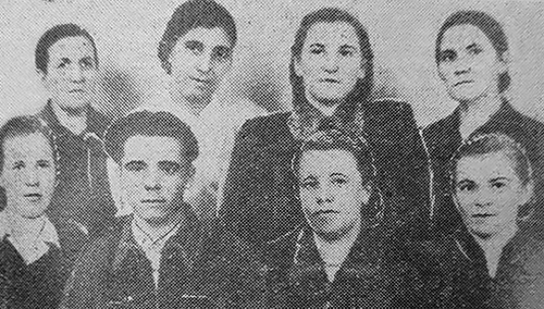 Ткачи одного из передовых на фабрике «Организованный труд» комплекта помощника мастера Николая Александровича Шевченко. (Слева направо) в первом ряду: Т. Степанова, Н. Шевченко, Е. Захарова, Н. Ханина; во втором: П. Шеленкова, М. Гришанкина, А. Зиновьева, К. Родионова.