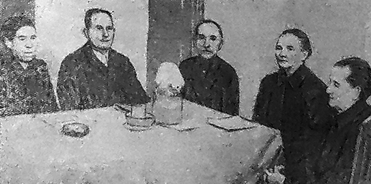 На снимке (слева направо): А.П. Быкова, В.Д. Леонтьев, И.А. Тюльков, Н.А. Жаркова и М.О. Мартынова во время беседы в поселковом Совете.