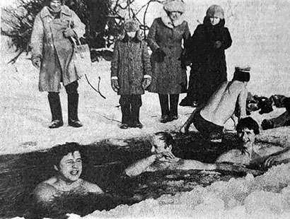 С декабря 1987 года эта четверка систематически купается зимой в проруби. Всем за тридцать, они практически не болеют простудными заболеваниями, чувствуют себя бодро. Возможно, что занятию «моржей» последуют и другие жители поселка. Е. ИГУМНОВА» («Знамя», 28 февраля 1989).