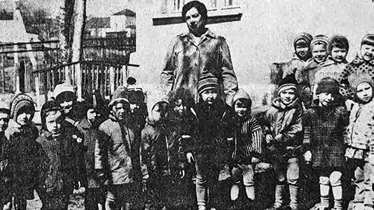 «Яркое первомайское солнце осветило комнаты детсада № 2 фабрики «Оргтруд». На детском утреннике заведующая т. Белова интересно рассказала о великом празднике. После состоялись выступления. Четырехлетняя Зоя Муратова продекламировала стихотворение «Маленький летчик». Дети старших групп исполнили украинские танцы, а хор — «Песню о Сталине», «Счастливый день» и др. Стахановка фабрики «Оргтруд» К.Т. Кувалдина» («Призыв», 7 мая 1941). В годы Великой Отечественной войны ясли, детский сад работали круглосуточно, это спасало детей от голода, так как детские учреждения понемногу снабжались продуктами и хоть не досыта, но детей кормили.