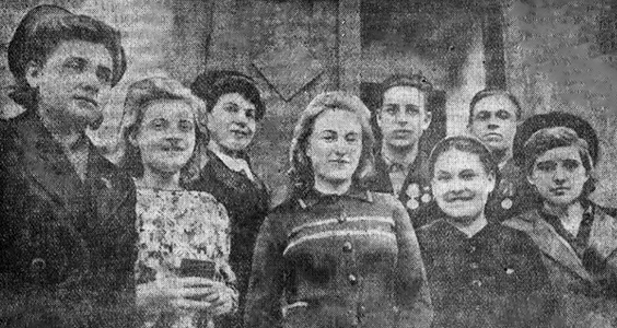 Группа участников слета, награжденных значками: «Отличник социалистического соревнования текстильной промышленности» и получивших Почетные грамоты Центрального и областного комитетов ВЛКСМ. Ткачиха фабрики «Оргтруд» Валентина Ефимова (четвертая слева)