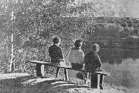 «День в пионерском лагере Здания пионерского лагеря, спортивные сооружения, кино-площадка затерялись в густой зелени кустарников и деревьев. С крутого берега, у подножья которого несёт свои серебристые воды Клязьма, открывается чудесный вид на привольные заливные луга. Каждый день этого маленького городка и его весёлых обитателей наполнен увлекательной и содержательной жизнью. ...Яркое солнце пробивается сквозь листву, сгоняет с трав сверкающие капельки росы. 7 часов утра. Пора вставать. Бодро звучит пионерский горн. Проснувшись, мальчики и девочки выбегают на зарядку. Весело играет баян, и даже у самых сонливых ребят пропадает желание ещё немного понежиться. После гимнастики пионеры умываются, аккуратно заправляют кроватки. Линейка... Ребята выстраиваются в ряды. Идут последние приготовления к торжественной минуте — подъёму флага. Сегодня это право предоставляется семикласснику Юре Гусеву. Он торжественно выполняет своё поручение. Алое полотнище гордо реет в лазоревой вышине. Позавтракав, мальчики и девочки расходятся по своим отрядам. Много увлекательных, интересных дел ожидает их. Ребята первого отряда, в который входят учащиеся 5, 6, 7 классов, под руководством пионервожатой Антонины Ивановны Тумановой разучивают танцы, песни, стихи. Они готовятся к предстоящему конкурсу на лучшего певца, танцора, чтеца. Не менее интересен и у ребят второго отряда — четвероклассников и трёхклассников. Они вслух читают «Повесть о Зое и Шуре». По этой книге у них скоро будет читательская конференция. Есть в лагере и много других увлекательных дел. Драмкружковцы готовят к постановке две шуточные пьесы: «Осип Иванович» и «Множественное число». Руководитель этого кружка распределила между пионерами роли. Пьесы ребята покажут на одном из концертов художественной самодеятельности.