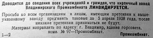 «Начал работу новый кирпичный завод На-днях во Владимире начал работу кирпичный завод райпромкомбината (бывший завод Петровского; до сих пор этот завод бездействовал). Выработка кирпича производится пока ручным способом. На заводе работает 8 квалифицированных порядовщиков. Все они дают первосортную продукцию и выполняют норму на 100 и больше процентов. К 5 июня ожидается еще 4 порядовщика. С их приездом выработка кирпича достигает 10 тысяч штук в день. Есть нa заводе и кирпичный пресс, но он не работает — нет мотора. За мотором промкомбинат еще 17 мая послал в Днепропетровск своего техника Половинкина. Половинкин сидит там, караулит мотор, но взять его не может, так как промкомбинат задерживает перевод денег. Плохо обстоит дело с бытовыми условиями рабочих нового завода. Есть прекрасное, светлое общежитие, но оно не оборудовано, нет хороших матрацов, совсем нет подушек, простыней, одеял, нет культурной столовой, отсутствует красный уголок, нет газет. Директор завода Самойлов не интересуется бытом рабочих, а предзавкома кирпичников Куликов на новом заводе еще не был ни разу. Кузнецов» («Призыв», 2 июня 1936).
