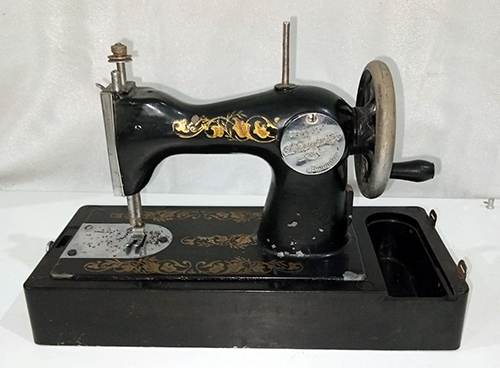 Машинка мини-швейная с ручным приводом завода «Автоприбор», 1947 г. выпуска, г. Владимир. На основании машинки имеется ячейка для ниток и иголок. Основание и поверхность машинки украшены стилизованным растительным узором желтого цвета.