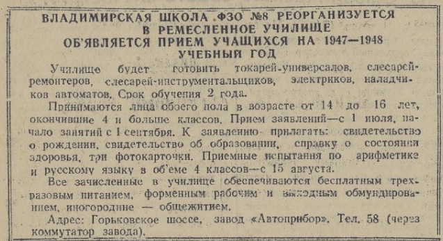«При Владимирском заводе «Автоприбор» создана школа ФЗО. Школа рассчитана на 100 человек. Она будет готовить токарей, автоматчиков, фрезеровщиков, сверловщиков» («Призыв», 10 сентября 1946). «Будущие мастера На стенах, на столах, на табуретках еще не высохла краска. Белоснежные пахучие стружки шуршат под ногами. Стекольщики вставляют в окна последние стекла. Еще не закончены ремонтные работы, а в школе уже кипит жизнь. В одной из комнат заседает призывная комиссия. Вот к столу подходит белокурый подросток, одетый в теплую защитного цвета фуфайку. Это Юра Александров, воспитанник Владимирского детского дома. Во время войны он потерял родителей и сейчас хочет приобрести специальность. — Хочу быть слесарем, — говорит он. За ним с заявлением в руках подходят подруги — Тоня Голубева и Лида Ерастова. Они просят, чтобы их зачислили в группу токарей. 150 юношей и девушек придут в новую школу ФЗО, организованную при заводе «Автоприбор». С каждым днем увеличивается приток заявлений от добровольцев. В школу уже зачислено сейчас 46 добровольцев из Владимирского, Петушинского, Ставровского районов, скоро приедут призывники из Ковровского и Небыловского районов. Школа неплохо подготовилась к встрече своих будущих питомцев. В одном из заводских цехов создается учебная мастерская, оборудованная прессами, токарными, фрезерными и сверлильными станками. Учащиеся будут жить в светлом и уютном общежитии, расположенном поблизости от завода. В свободное от учебы и работы время воспитанники будут культурно отдыхать. К их услугам — красный уголок и библиотека. Для приобретения культурного инвентаря дирекция завода выделила 10 тысяч рублей. Закуплены гитары, балалайки, гармонь, настольные игры и т. д. Мастерами в школу направлены лучшие производственники завода Мордвинов, Лебедев, Егоров, Теплухин. С большим воодушевлением берутся они за обучение и воспитание молодежи. П. ШЕРЫШЕВ» («Призыв», 22 ноября 1946). «РЕМЕСЛЕННОЕ УЧИЛИЩЕ ПРИ «АВТОПРИБОРЕ» Школа ФЗО №8 при Владимирском заводе «Автоприбор» реорганизуется в ремесленное училище с двухгодичным сроком обучения. Училище будет готовить токарей-универсалов, слесарей-ремонтеров, слесарей-инструментальщиков, электриков, наладчиков автоматов» («Призыв», 13 июля 1947).