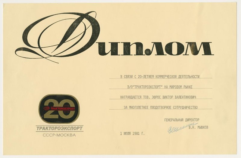 Диплом объединения «Тракторэкспорт» Эфросу Виктору Валентиновичу за многолетнее плодотворное сотрудничество, в связи с 20-летием коммерческой деятельности в/о «Трактороэкспорт» на мировом рынке. 1 июля 1981 г.