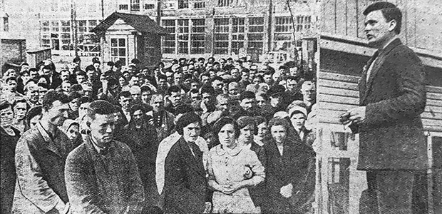Митинг рабочих, служащих и инженерно-технических работников. Выступление начальника отдела т. Коляда, награжденного медалью «За трудовую доблесть».