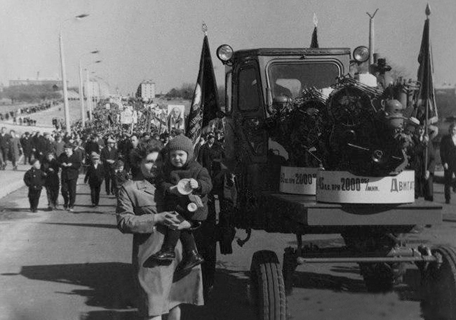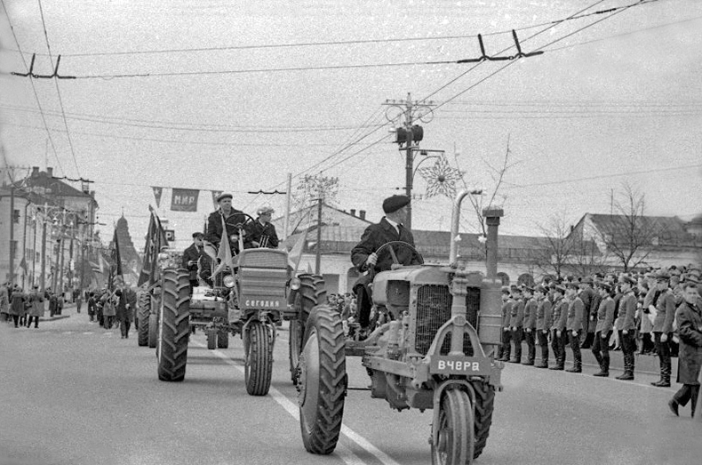 Колонна тракторов Владимирского тракторного завода на демонстрации в День международной солидарности трудящихся. 1 мая 1969 г. Улитин Виктор Григорьевич