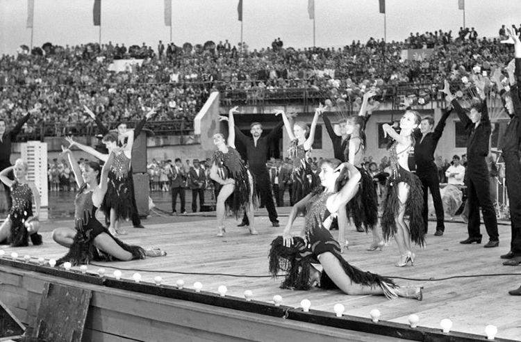 Театрализованное представление «Нет у революции конца» на стадионе «Торпедо», посвященное Дню города Владимира. Выступление ансамбля «СТЭП» Владимирского областного Дворца культуры. 28 августа 1988 г. Фото Соколова Петра Петровича