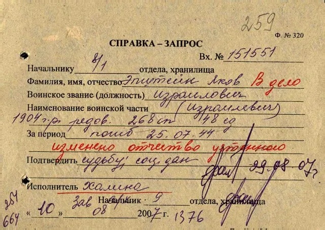 14 декабря 1943 г. Эпштейна Якова Израилевича за срыв сроков строительства и финансовые нарушения освободили от обязанностей директора Владимирского тракторного завода, с него сняли «бронь» и отправили на фронт.