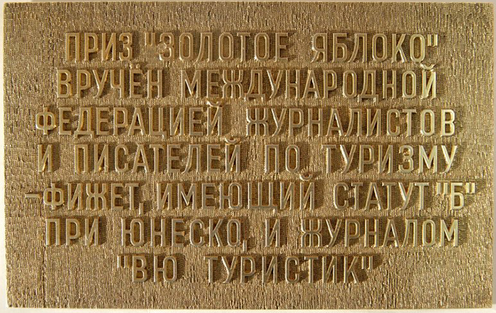 Диплом ФИЖЕТ (Международной федерации журналистов и писателей по туризму) о присуждении городу Суздалю почетного приза «Золотое яблоко». 1983 г. Футляр для почетного приза ФИЖЕТ «Золотое яблоко». 1983 г. Пластина от почетного приза ФИЖЕТ «Золотое яблоко». 1983 г. Почетный приз ФИЖЕТ г. Суздалю. Золотое яблоко. 1983 г.