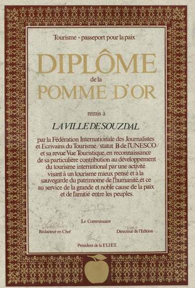 В октябре 1982 года конгресс ФИЖЕТ, состоявшийся в Португалии, сделал официальное сообщение: шестнадцатым обладателем «Золотого яблока» стал Суздаль — один из старейших и прекраснейших городов России. Формулировка, занесенная в документы, была такая: «За сохранение и реставрацию памятников культуры, использование их в интересах туризма и за создание туристского центра».