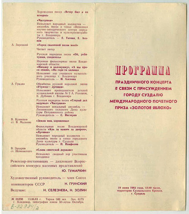 Программа праздничного концерта в связи с присуждением городу Суздалю Международного почетного приза «Золотое яблоко» 19 июня 1983 г. в г. Суздале. 1983 г.