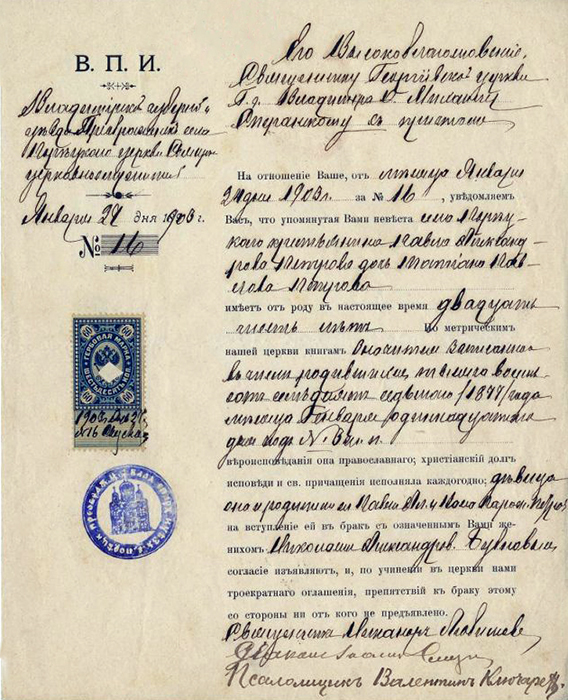 Уведомление № 16 церковнослужителей Преображенской церкви с. Порецкое Владимирского уезда священнику Георгиевской церкви г. Владимира М.А.Сперанскому о том, что к вступлению в брак крестьянки с. Порецкое Петровой Татьяны Павловны с Бубновым Николаем Александровичем препятствий нет. 29 января 1903 г.