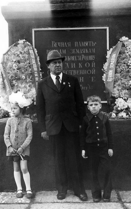 Курилов Григорий Матвеевич с двумя внуками у памятника погибшим в годы Великой Отечественной войны. 1980 г. Порецкое. 1982 г. Автор: Привезенцев Андрей Владимирович