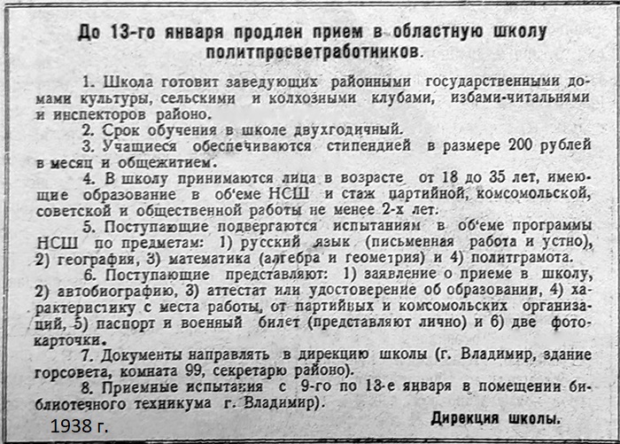 «Сейчас по партийным и комсомольским организациям начинается вербовка курсантов во владимирскую губсовпартшколу. Зачастую партийные и комсомольские организации относятся к этой вербовке несерьезно. В совпартшколу попадали недостаточно подготовленные товарищи. Проучившись три месяца и даже год, отдельный партиец или комсомолец увольнялся из школы, как совсем не имеющий способностей в совпартшкольской учебе. А между прочим, на этого товарища затрачено от 800 до 1000 руб. в год. В настоящий учебный год губсовпартшкола расширяет состав учащихся. Надо серьезно отнестись к их подбору. Посылая товарища в партшколу, прежде всего, нужно проверить его способность к теоретическим занятиям, партийную выдержанность. Сама приемочная комиссия губсовпартшколы должна жестко придерживаться правил приема в школу. Пусть курсантов СПШ будет количеством поменьше, да качеством получше» («Призыв», 13 августа 1927).
