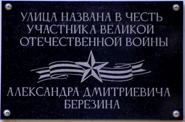 - В 1985 г. в гор. Владимире, в канун 40-летия Победы, бывший проезд Связи переименован и назван улицей имени А.Д. Березина. Улица находится в Октябрьском р-оне, идет от ул. Кирова до ул. Краснознаменная, параллельно ул. Горького. Тогда же и соответствующую табличку тоже разместили, но после капитального ремонта дома №1 она была утеряна. Об этом - в ходе научной работы узнали ученики 4 класса школы № 22. Вместе со своим педагогом они решили исправить несправедливость - чтобы имя героя не забыли. С предложением сделать новую мемориальную доску они обратились в Законодательное Собрание региона, городскую администрацию и там - инициативу поддержали.