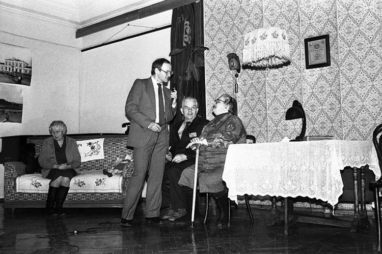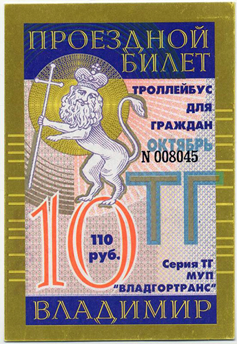 Морозов Николай Андрианович, заведующий отделом истории советского общества Владимиро-Суздальского музея-заповедника, ведущий мероприятия «Когда мы были молодыми...», берет интервью у кондуктора первого троллейбуса г. Владимира Викман Лидии Григорьевны. 15 апреля 1999 г. Фото Суслина Николая Владимировича Проездной билет на троллейбус для граждан № 008045 на октябрь 2000 г. стоимостью 110 руб. Издание МУП «Владгортранс».