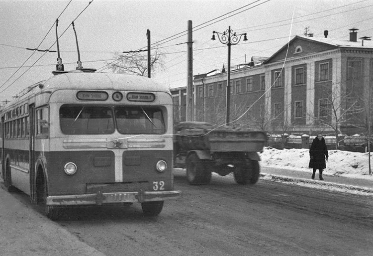 Открытие нового участка 3-ей троллейбусной линии. 17 августа 1958 г. Фото: Сидоров Алексей Алексеевич МТБ-82Д. № 21 — маршрут 4. Улица Фрунзе. Открытие движения по 4 маршруту ("Золотые ворота - Клуб кирпичного завода"). 26 января 1959 г. Автор фото - А.А. Сафаев. Открытие 4-ой троллейбусной линии "Золотые ворота - Клуб кирпичного завода". 26 января 1959 г.
