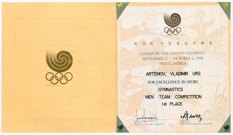 Диплом XXIV Олимпийских игр Артемову Владимиру за I-е место в командном первенстве по гимнастике в Сеуле 17 сентября-2 октября 1988 г.