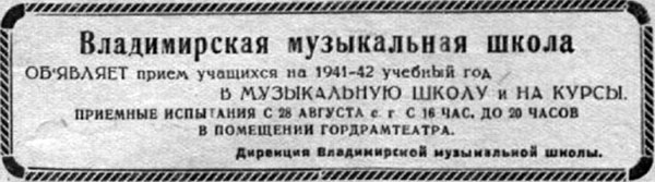 В военные годы школьное помещение Владимирской музыкальной школы было отдано под госпиталь. Занятия переместились в помещение драматического театра. Они шли в промежутках между репетициями и спектаклями.