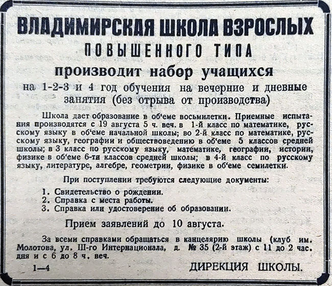 «При клубе им. Молотова имеется вечерняя совпартшкола. Преподавательским составом укомплектована она хорошо. Однако зав. клубом и заведующий школой о ней совершенно не заботятся. Пример можно взять хотя бы с того, что помещения, предоставляемые для занятий, имеют безобразный вид, при этом каждый раз помещения меняются, отчего иной раз совпартшкольцам по часу приходится отыскивать свободную комнату для занятий. Наглядных пособий (диаграммы, карты и т. д.) школа не имеет, а они необходимы. Благодаря нерадивого отношения к ВСПШ со стороны руководящей части, школа осталась без учебных наглядных пособий и без постоянного помещения, благодаря этого посещаемость слушателей снизилась до минимума (22 проц.). Вечерняя СПШ накануне развала. Но что делают партколлективы службы тяги, движения и пути и что делает культпроп. т. Власов? Об этом никто ничего не знает» («Призыв», 26 февраля 1932).