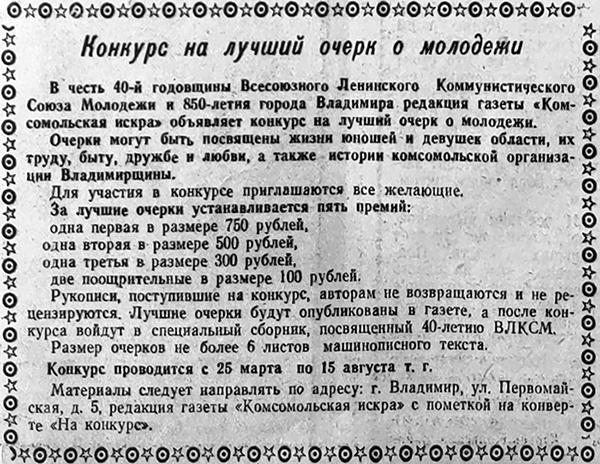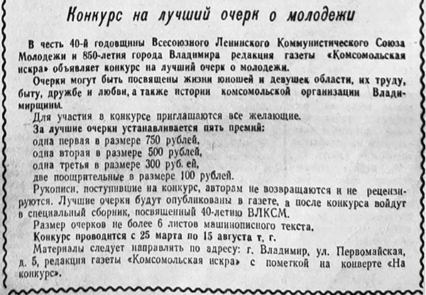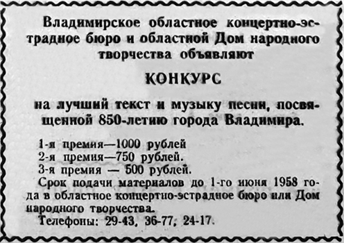«Конкурс юных фотолюбителей в честь 850-летия Владимира Владимирский областной отдел народного образования, обком ВЛКСМ и областная станция юных техников объявляют конкурс на лучший фотоснимок. Фотографии высылаются в адрес областной станции юных техников до 10 июля 1958 года. Победители конкурса награждаются Почетными грамотами обкома ВЛКСМ и ценными подарками» («Комсомольская Искра», 2 марта 1958).