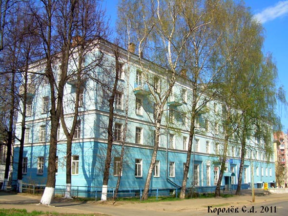 «На улице Горького, рядом с Домом культуры Владимирского тракторного завода, на прошлой неделе было заселено общежитие Владимирского строительного техникума. Девяносто пять комнат, приняли 300 учащихся техникума. Для них здесь имеется все необходимое: просторные, светлые кабинеты для занятий, кухни, умывальники. Новое общежитие является первым общежитием города, при котором оборудована столовая на 75 посадочных мест, изолятор с кабинетом врача, больничные палаты. Прекрасное общежитие подарило государство учащимся к юбилею города Владимира. А. АВДОШИН, В. ЧЕРНОВ, слушатели школы юнкоров» («Комсомольская Искра», 19 февраля 1958).