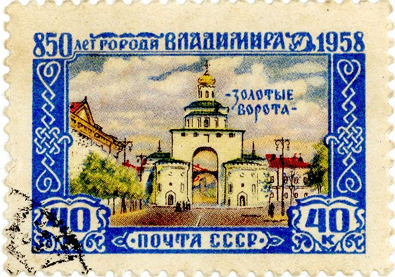 Марка поятовая. 850 лет города Владимира. Золотые ворота. 40 копеек. 1958 г. СССР.