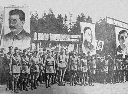 «12 июня состоялось открытие Н-ских лагерей. Открытие было посвящено предстоящим выборам в Верховный Совет РСФСР и боевой летней учебе бойцов. На огромной луговине, примыкающей к сосновому лесу, стройные ряды бойцов, большие группы приехавших гостей - трудящихся. Море портретов великого вождя и учителя товарища Сталина, его боевых соратников, портретов кандидатов в депутаты верховного Совета РСФСР от избирательных округов Ивановской области. Десятки плакатов, зовущих отдать голоса за кандидатов Сталинского блока коммунистов и беспартийных. На митинге бойцы и командиры встретились с кандидатами в депутаты Верховного Совета РСФСР тов. Коротковым Г.Е., Медведевым С.К. и Егоровой Н.П., которые в своих ярких речах призвали участников митинга к усиленной боевой учебе. Бурными аплодисментами, мощными криками «ура» каждый раз встречали все присутствующие на митинге дорогое, любимое имя великого Сталина, имя командира командиров товарища Ворошилова. Тепло, радостно приветствовали бойцы и командиры своих кандидатов в депутаты Верховного Совета РСФСР тт. Короткова, Медведева, Егорову. После митинга состоялось выступление физкультурных коллективов и конников, ярко показавших ловкость, уменье, силу мускулов и отвагу. Представители бойцов и командиров заверили, что они лагерный период проведут в напряженной учебе, с честью выполнят все задачи, поставленные перед ними любимым наркомом товарищем Ворошиловым и, усиливая бдительность, будут изо-дня в день крепить боевую мощь своей прекрасной родины. Не допустим, чтобы вражеская нога топтала священную землю советской страны! - В день выборов, - заявили бойцы,- мы все, как один, отдадим свои голоса за кандидатов Сталинского блока коммунистов и беспартийных!» («Призыв», 14 июня 1938).