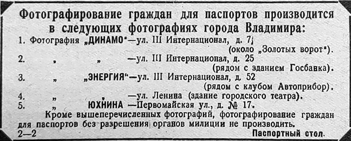 «Посещение московскими архитекторами Владимира Наш город посетила группа московских архитекторов (25 человек). Они работают в архитектурных и других проектных мастерских столицы. Архитекторы с большим интересом осмотрели исторические памятники нашего города, сделали с них несколько фотоснимков и зарисовок. Экскурсанты отметили необходимость скорейшей реставрации бывшего Дмитриевского собора - этого ценнейшего памятника древней архитектуры. В. Язвиков» («Призыв», 21 июня 1938).