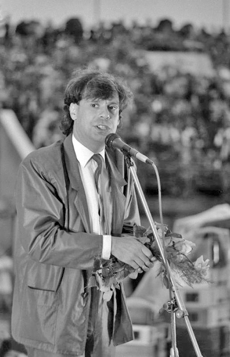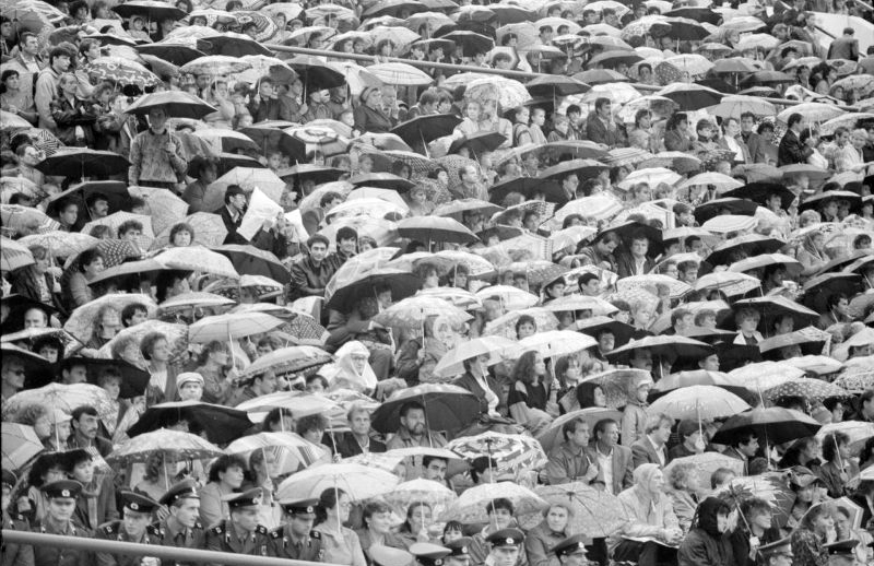 Зрители на трибунах стадиона «Торпедо» во время театрализованного представления «Нет у революции конца», посвященного Дню города Владимира. 28 августа 1988 г. Театрализованное представление «Нет у революции конца» на стадионе «Торпедо», посвященное Дню города Владимира. Выступление певца Антонова Юрия Михайловича. 28 августа 1988 г. Фото Соколова Петра Петровича
