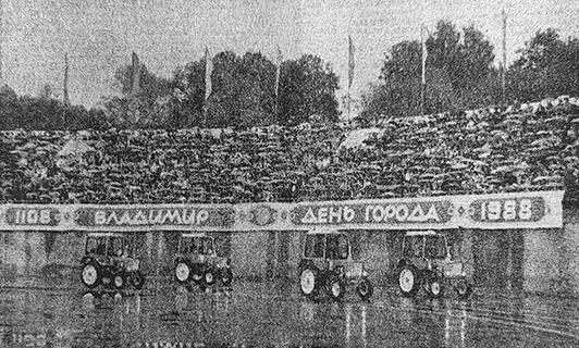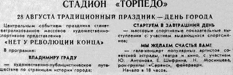 «Щедрое сердце города С утра и до позднего вечера центральные улицы и площади Владимира, его парки были заполнены людьми — было на что посмотреть. Всевозможные выставки, концерты участников художественной самодеятельности, различные благотворительные мероприятия, широкая торговля промышленными товарами, изделиями кооператоров — все это создавало атмосферу непринужденности, веселья, открывало щедрое сердце города. Народное гулянье закончилось поздно вечером на стадионе «Торпедо», впервые после реконструкции принявшем на свои трибуны зрителей.
