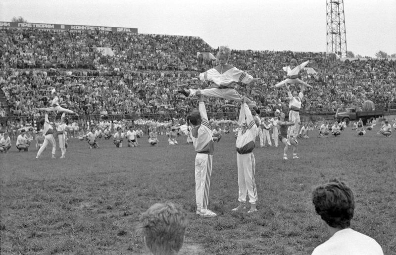 Театрализованное представление «Нет у революции конца» на стадионе «Торпедо», посвященное Дню города Владимира. Выступление гимнастов. 28 августа 1988 г. Фото Соколова Петра Петровича