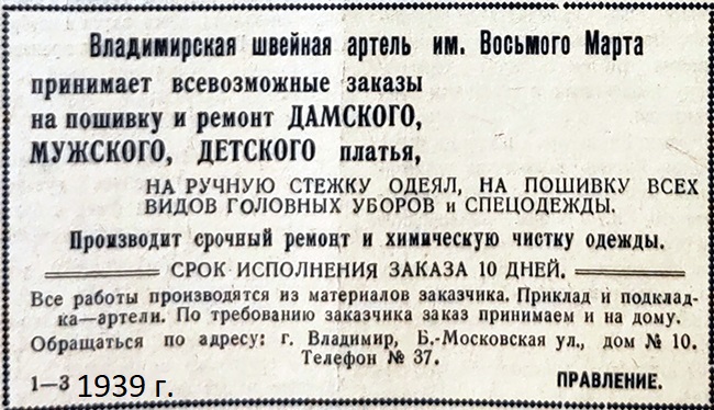В 1910 году заведение Коиля занимало в доме Бузина на Дворянской улице всего один «покой». «Доктор М.Л. Юделевич возвратился. Прием по бол.: внутренним, женским и мочеполовым ежегодно от 10 до 1 ч. и от 5 до 8 ч. веч. Дворянская, д. Бузина, тел. 232» (газета «Владимирская жизнь», 1917). «Владимирская школа ФЗО № 25 продолжает набор учащихся в строительные группы. Принимаются юноши в возрасте 17—18 лет. Всe принятые обеспечиваются бесплатным трехразовым питанием, форменным обмундированием, общежитием. Обращаться: ул. Большая Московская, д. 2 (против Золотых ворот)» («Призыв», 28 марта 1947).