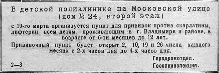 1938 год Ул. Дворянская, д. 24б. «Детская городская поликлиника № 1 г. Владимира». Закрыта в 2018 году.