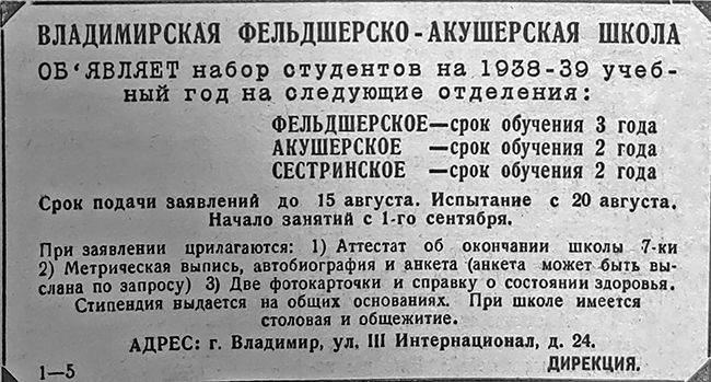 «Условия поступления во Владимирский Медицинский Политехникум на 1930-31 год. Политехникум имеет два отделения – акушерское и техников по уходу (б. медсестер по уходу), на последнее принимаются лица обоего пола не моложе 16 лет, на акушерское – только женщины не моложе 17 лет и не старше 30 лет для обоих отделений… Заявления подаются или пересылаются по почте в адрес политехникума (г. Владимир, ул. Фрунзе, 63) с приложением двух десятикопеечных почтовых марок на ответ… Начало учебных занятий 20 августа с.г.» («Призыв», 1930).