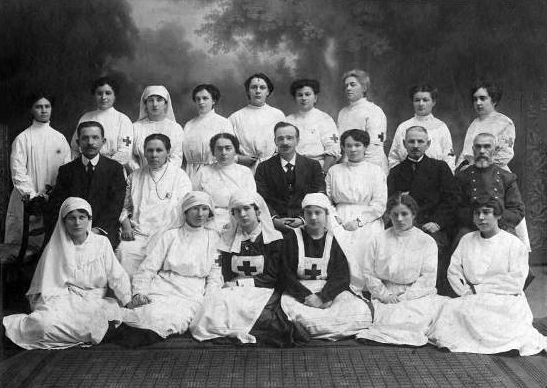 Хирург Орлов Николай Алексеевич в группе врачей и медицинских сестер Владимирского госпиталя. Около 1918 г.