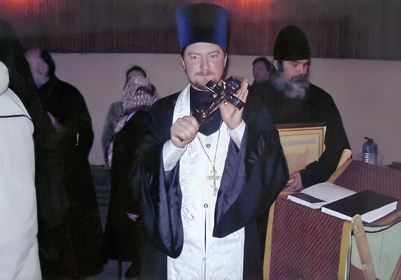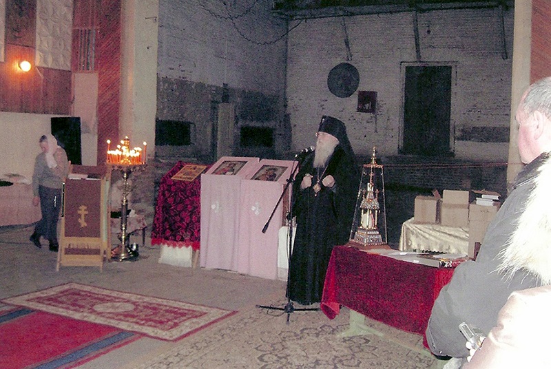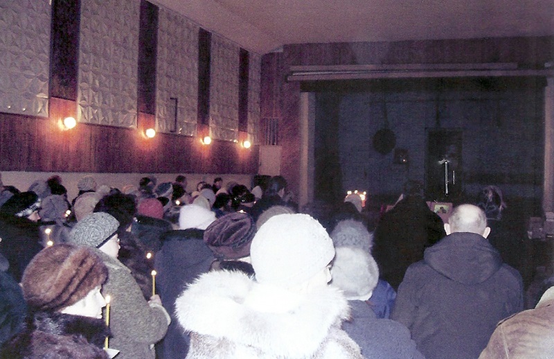 На первое время был выстроен временный алтарь в бывшем фойе клуба, где и проходили службы.