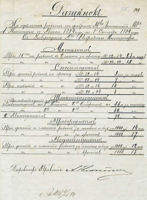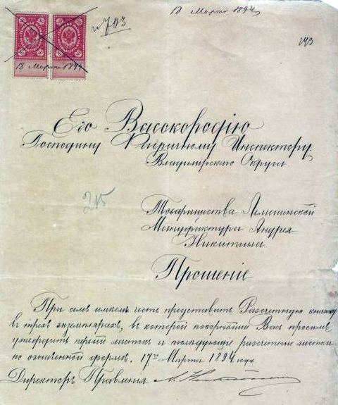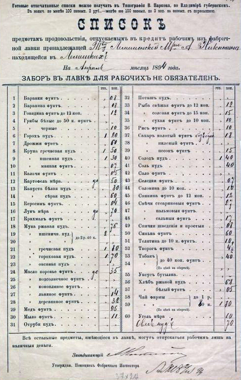 Прошение директора правления Товарищества Лемешенской мануфактуры Андрея Никитина фабричному инспектору Владимирского округа об утверждении формы первого и последующих расчетных листков «Расчетной книжки». 17 марта 1894 г. Расценок на сдельные работы на фабрике Товарищества Лемешенской мануфактуры А.Никитина с Пасхи 1894 года по 1-е октября 1894 года. 8 апреля 1894 г. Список предметов продовольствия, отпускаемым в кредит рабочим из фабричной лавки, принадлежащей Товариществу Лемешенской мануфактуры А. Никитина, находящейся в Лемешках, на апрель месяц 1894 года.